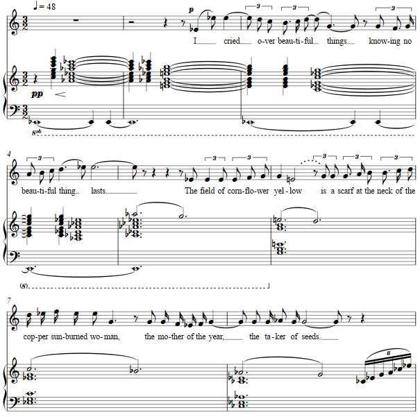 The long arch of a succession of chords, doubled in the hands in softest dynamics, makes a more static gesture which then gives way in the second section to movement, at the calling up of images of northwest wind and that first spit of snow. The voice declaims in hushed tones,