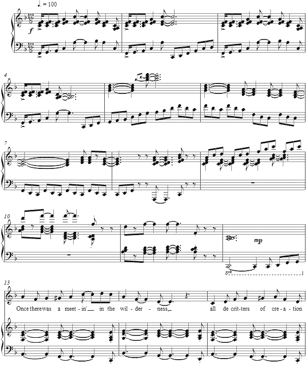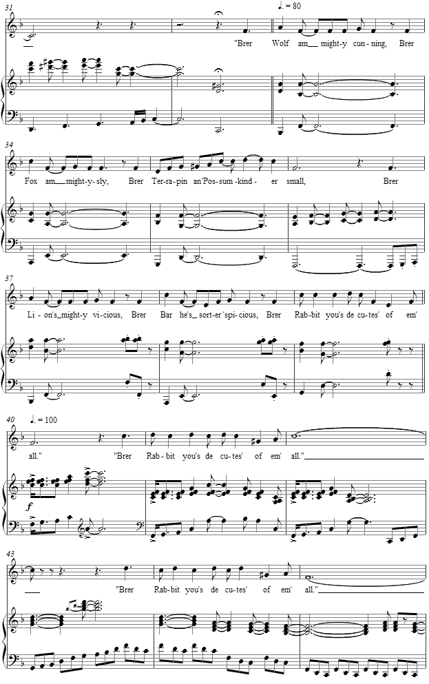 The setting opens with a prolonged prelude, syncopated and broad ranging, rooted in an Americana signature of this music hall style. The form of the setting is of verse and chorus following, repeated twice. The up tempo verse yields to "ole Jedge Owl's" conclusion, which is the consistent conclusion of all these various tales. Brer Rabbit is the cleverest, smartest and in this case "cutest" of all the other creatures as well.