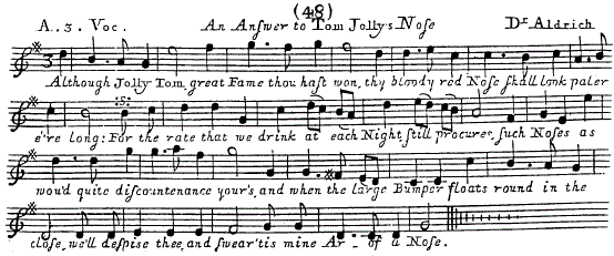 The theme is drawn from The Catch Club or Merry Companions being a Choice Collection of the most Diverting Catches for three and Four voices Compos'd by the late Mr. Henry Purcell, Dr. Blow & c. The text for this round [ 1 ] reads: "Although, Jolly Tom, great fame thou hast won, / thy bloody red nose shall look paler e're long! / For the rate that we drink at each night still procures / such noses as would quite discountenance yours! / And when the large bumper floats 'round in the close, / we'll despise thee and swear 'tis mine Arse of a Nose!."