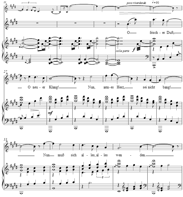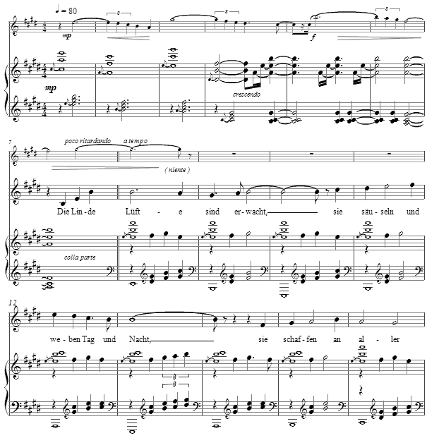 The second portion of each strophe is heightened by a poco pìu mosso and the rising vocal line, to reinforce the sense of freshness in the air, that of which the poet speaks in his "belief" grounded in the return of springtime.