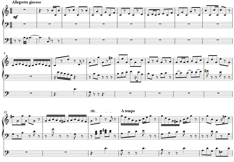 Another 6/8 jig, its subject begun to emphasize the major seventh of the scale. A number of statements appear in domains beyond the basic tonic and dominant.