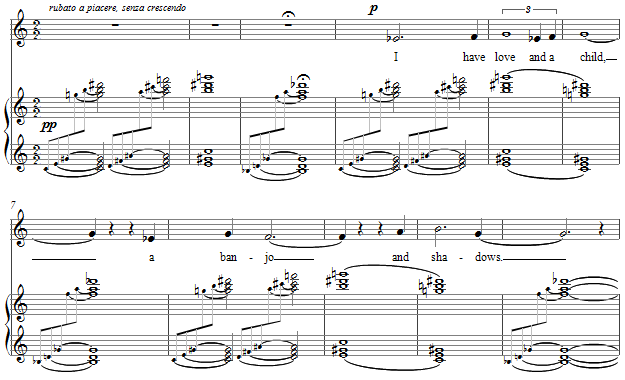 This simple, short setting is made up of augmented triads at the unison and a transposition above of a twelfth. For the inference of the whole tone scale, the chord successions and vocal line are consistently this as well, as the text tells of a known future in sweet and yet foreboding small and enormously important details.