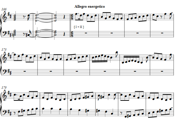 Returning to a contrapuntal texture, the next little fughetta is flavored with notated turns for both voices.