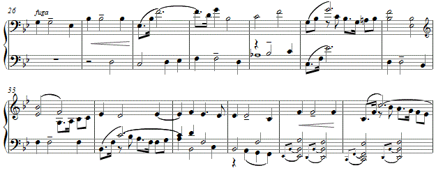 The fugue is also lento, very simple and returns to the opening phrase of the prelude as its coda.