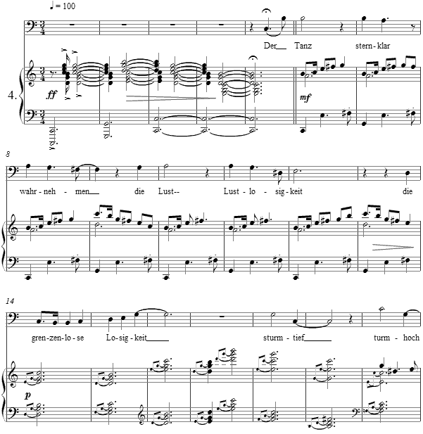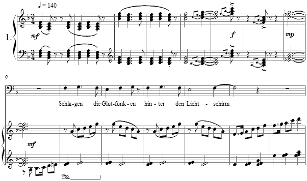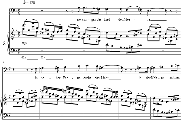 A two-voiced parallelism shifts from chord to chord, suggesting E in the minor and major, as the vocal moves between the tonality changes accordingly. The distant changes of light are suggested by the upper range of the piano as the light dissonances play against one another.