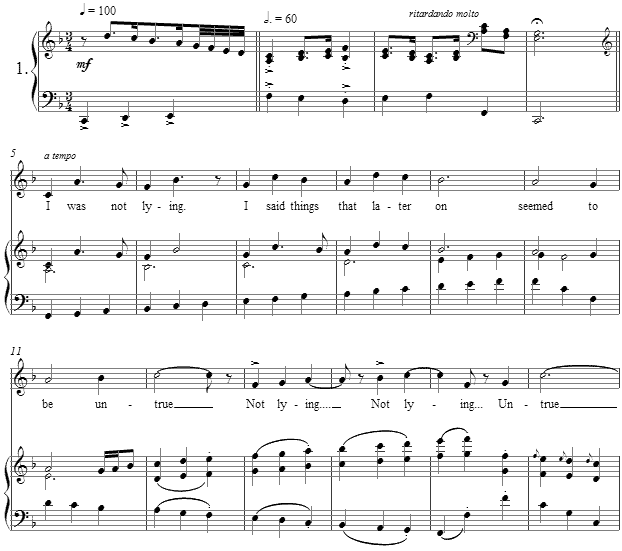 I chose to begin this cycle with the presidential pardon of Richard Nixon by Gerald Ford, and from it and other apologies for gaffes comes the cycle's title. A short quote from "Hail to the Chief" introduces this jaunty 3/4 time song, accompanied by parallel diatonic sevenths, dissonances within the consonance of the whole which remains staunchly in a major tonality throughout.