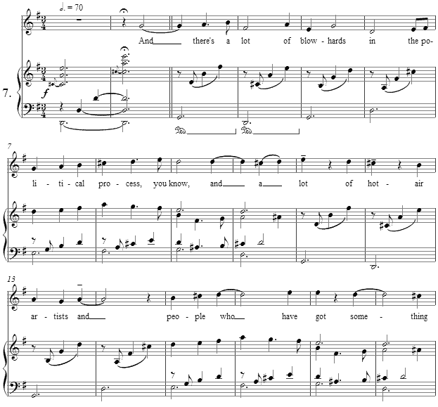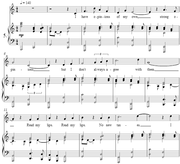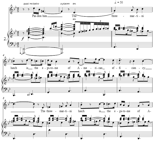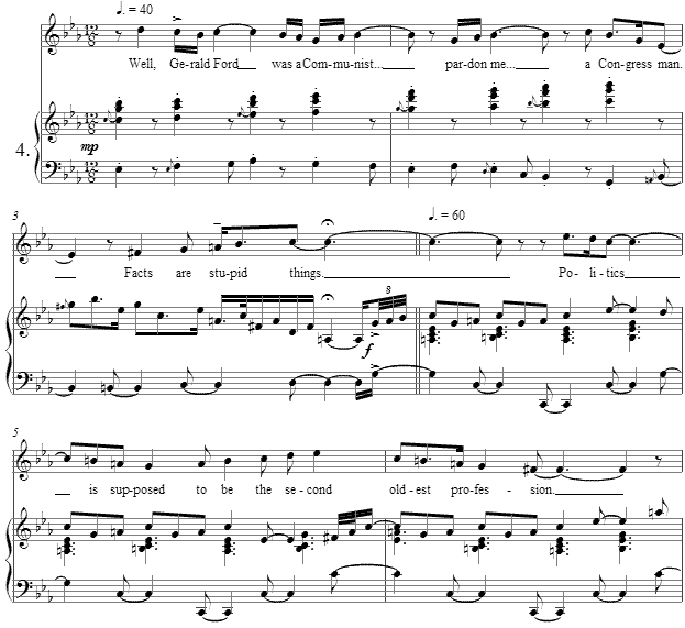 The very silly comment by Gerald Ford is set in 6/8 time, and begins with a recitative-like "pardon," as it was Ford who pardoned Richard Nixon, thereby relieving him of the embarrassment of potential prosecution. That a "three-martini lunch" epitomizes American efficiency is laughable, of course, and meant as a joke. An "earful," a "bellyful" and a "snootful" make for a fine image of gluttony, and this setting echoes the triple time gestures of burlesque theater.