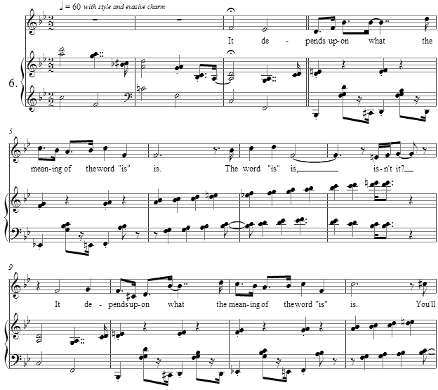 The elder Bush lost his election to the charming President Clinton, who himself fell into so many gaffes. Central to that ridicule of his presidency was his "exploits" which I chose to ignore, per se. Rather I chose to set his tortured verbal argument about the "meaning of the word 'is' is." It is set in a jaunty, dotted rhythm and seemingly flippant accompaniment, treating lightly what was certainly something not to be so treated. The setting vacillates between a duple metered, popular-styled accompaniment figure and then simple, dissonant seconds to break away, only to return again to the more flippant musical gestures.