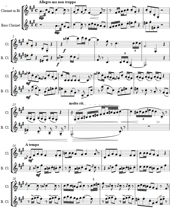 This duet for clarinet and bass clarinet takes two themes and weaves them together.