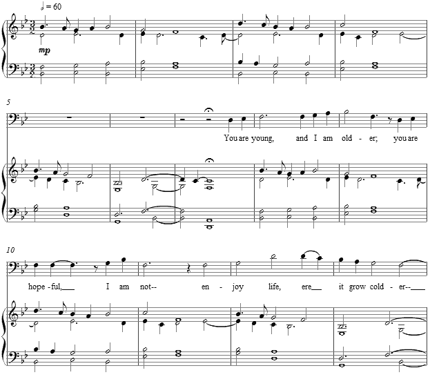 Written for baritone and piano, this setting evokes what some might incorrectly call "a simpler time." In fact the period leading up to the Civil War and continuing presidency of Lincoln was of far greater complexity than today's rather benign and bountiful time for most in the Western world. Even so, that Lincoln would take the time to express words such as these in rhyme shows a gentle side to the man concerned in the moment with a young lady's well being. The advice to "seize this day" is not at all misplaced, for in fact what time have we but the now in which we live, work and even dream.