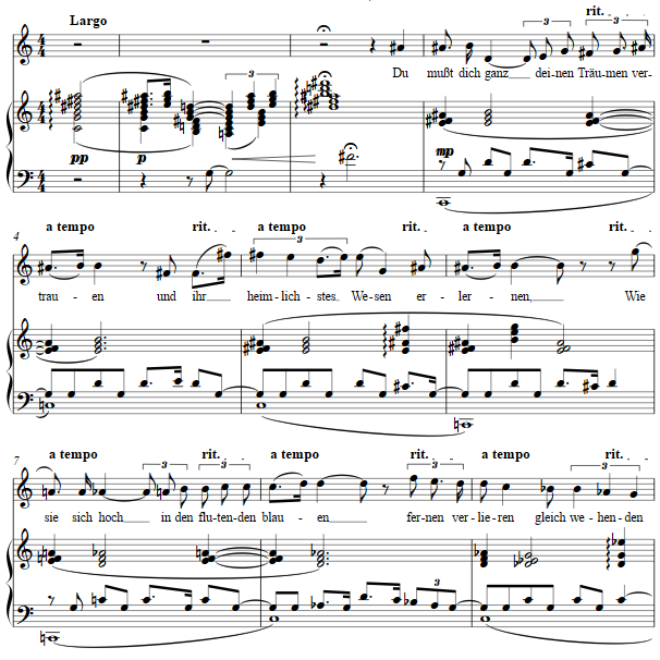 The extended harmonies act functionally in long arches as the text is declaimed lyrically. Rubato is of course recommended, as so often ritardando and a tempo markings recur.