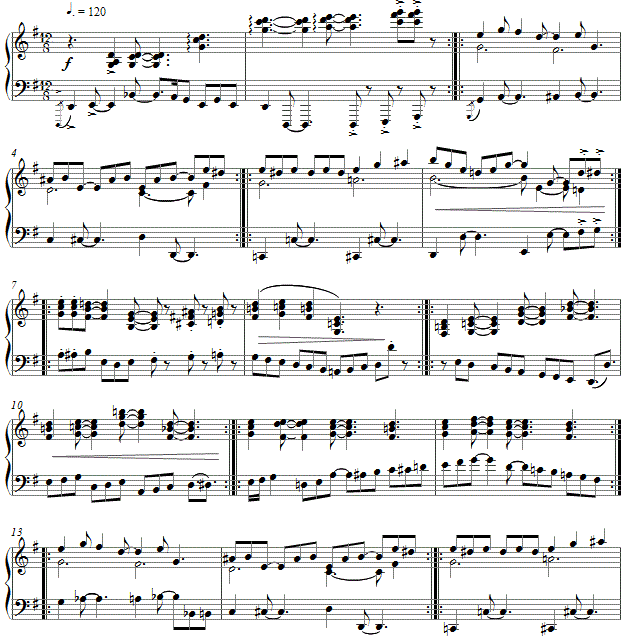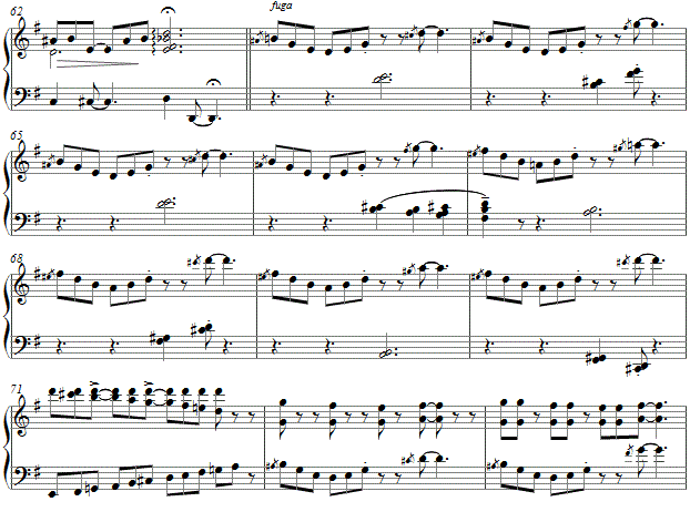 This has been a little exercise in writing two-bar phrases which when strung together would form a work. Thus the "licks" are each repeated twice until the first small fugue is begun. The lighter, popular style is a levity against the more severe sides of music, as I have been working to finish an opera of dark and dramatic mood in this same period.