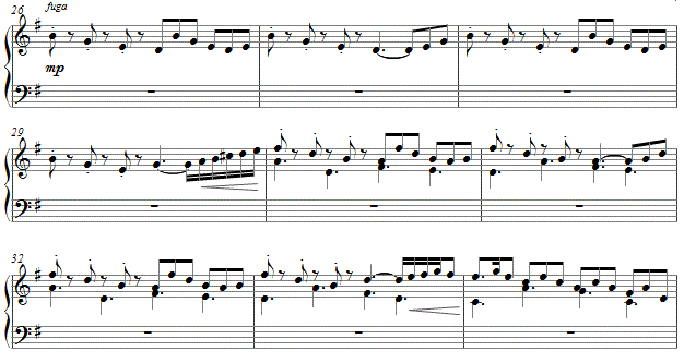 The first of the fugues is structured as a small hemiola, within the measure. For this the counterpoint is suggested as opposing this musical sense.