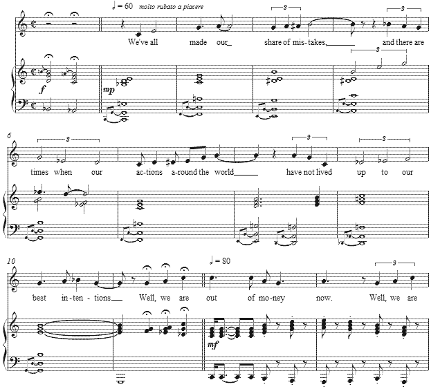 NOTES [ 1 ] From our terrace, we see the top of the historic victory column at the center of Berlin's Grosse Stern -- or "great star" which is a roundabout meeting of several main avenues -- peering over the trees. This column commemorates the Prussian victory in the Danish-Prussian war, and was given further military significance after the defeat of Austria in the Austro-Prussian war of 1866 and over France in the Franco-Prussian war from 1870-71. The Obama speech at this Siegesäule in the center of the Tiergarten in Berlin on 24 July, 2008, was hailed by many pundits as something of an epiphany. I saw it as just another political speech, akin to so many others, pushing all the expected buttons and extending hyperbole to a height not usually heard in recent German politics. When one parses only this particular line which finds its way into my song text, who would argue that any of us has not made mistakes? Who would argue that our actions have not always lived up to our intentions? This notion is found in most confessionals from the liturgies of several faiths and many denominations, and yet such a statement was greeted by enthusiastic pundits as if something original. In politics, I have come to believe the only thing original is that a new generation has not heard the "same old, same old." For them if not exposed to the searing lessons of history, such is always "new." No matter how centuries old the "new" truly is. Earlier in this speech, which predates the interview which sparked this satiric setting, Obama stated as have others before him, "This is the moment to give our children back their future." For my skeptical perspective, the mounting public debt to uphold Ponzi scheme-like financing of today's government programs by borrowing from tomorrow declares such hyperbole false. Our children's future is demonstrably and unarguably more-debt ridden than previous generations thanks to such rhetoric as claims bettering their future world is not hugely impacted by borrowing today from tomorrow to pay for yesterday. Moreover such a statement, made less than a year ago, collides headlong with the statement made on CNN, as below. "Well, we are out of money now" is not positive statement for tomorrow's children; rather, it is the antithesis. If "we are out of money now," what will it be for the next generations? Their future is an unpaid, lingering and massive government debt, which paid for today and yesterday. "Give back to our children?" Based on simple arithmetic, this is the incarnate inanity of political speech which so easily averts its eyes from reality for the sake of the pursuit of money and power. This is as true, I argue, for Germany as it is for the United States, Great Britain (mentioned because of the recent spate of public financing scandals in the news) as for any other nation. A nation is not exempt from the simple financial good sense which should rule one's individual life. Growing debt is never an answer, but always a problem which has few but well-known and fully documented solutions. That politics around the world which pretends to be pragmatic forsakes such simple sense is becoming a consistent truth, in which political ideology overrules commonsense -- but only temporarily. As with any other addiction, this increasing addiction to relying on unpaid debt becomes a crisis and then a catastrophe. With this in mind, over morning coffee last year I penned The Fruit of the Money Tree, which is a parallel discourse in rhyme. [ 2 ] From the rather traditional Memorial Day weekend interview, this year with CNN's Steve Scully, May 23 2009. On sites which allow comment on such news and opinion, I have read one party's vain attempt to place all the blame on another party's growing public debt, but truth be told all political parties in elected positions have contributed to nations' debts, the most recent merely being the largest addition to the stack of IOUs. Blame for the sake of partisan political advantage proves out George Washington's advice to Americans made in 1796, in which he prophetically observed, political parties' interests will tend to trump national interests. For this sage advice, I find especially cynical the promises of political parties to create new jobs. If this strategy were indeed sound, the Union of Soviet Socialist Republics would not have collapsed internally, and the "republic" of Cuba, which has been freely and legally able to trade with 190 nations around the world without hindrance from the United States' embargo, would not be economically undeveloped and suffering its own fraying infrastructure. Economic growth creates jobs, and after a certain point as many theories suggest, economic growth is hindered by governance. If this were not true, then the biggest and most powerful socialist governments, from the National Socialists of Germany to the Communists of the defunct USSR, would still be "creating jobs." As with the presidents' gaffes which first sparked the song cycle, Seven Presidential Pardons to which this is an addendum, the magnificent rhetorical gaffes of the current president of 2009 are simply astounding, though minimized by those loyal to him and unwilling to see such gaffes as indicative of someone who sometimes speaks without thinking. Among my favorite gaffes not included in this text is the amazing remark made while speaking about a Supreme Court nominee, "And they are charged with the vital task of applying principles put to paper more than 20 centuries ago to some of the most difficult questions of our time." (May 2009) Twenty centuries is two thousand years, and that makes this president in particular either a fumbler with words, unaware, or innumerate -- that wonderful new adjective which identifies those for whom the difference between ten thousand and one million is that "ten" is bigger than "one." This, in of itself, explains to me why both major political parties in the United States of America have so easily appropriated 
